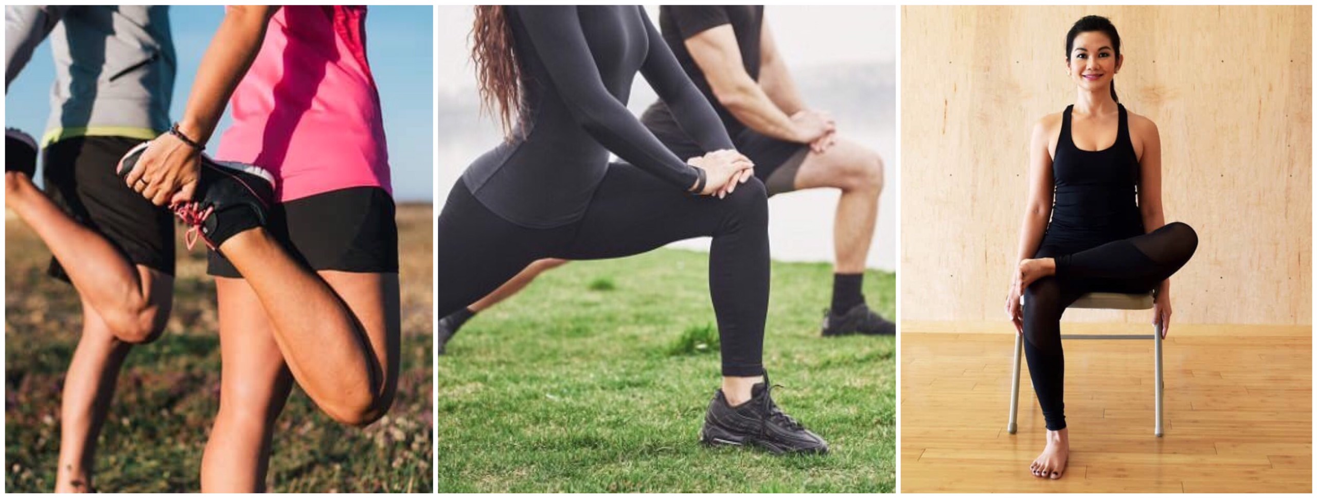 • Giãn cơ đùi trước: Đứng trụ trên chân phải, co chân trái ra phía sau. Dùng tay trái kéo căng chân trái về phía sau mà không thấy đau. Tay phải giơ lên cao, nếu bạn chưa quen giữ thăng bằng thì có thể dùng tay phải vịn vào vị trí nào đó. Giữ nguyên tư thế trong 30s giây rồi đổi bên. Làm lập lại 3 lần. Động tác này nhằm tránh chuột rút phần đùi.
